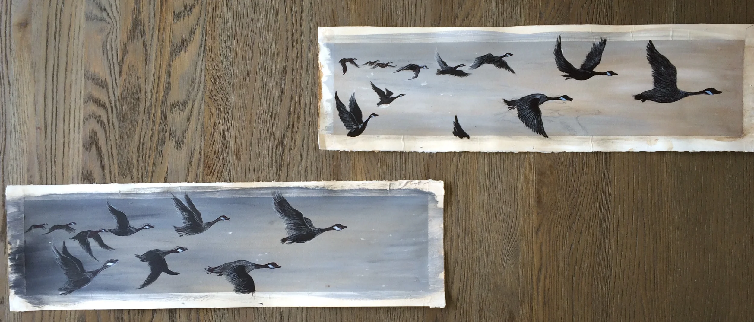These two paintings were created on strips on print making paper which had been prepared with gesso, coffee and charcoal. These geese were painted in acrylic, black ink and chalk. It has a little bit of everything. These paintings will be framed and hung along a hall in this staggered formation so it will lead you down the hall. Follow the Geese…Southbound.